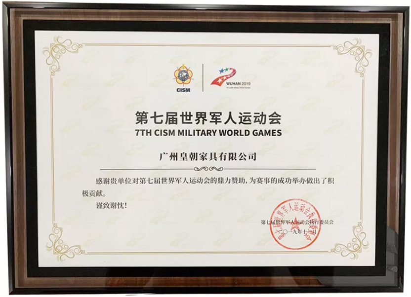 而今日 星辰影视,皇朝家私也收到一份特别的礼物,第七届世界军人运动会执行委员会特授牌皇朝.