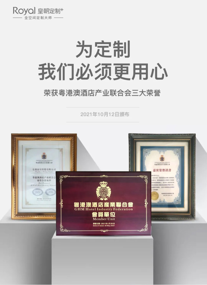 在本次大会上,皇朝定制不仅成为了粤港澳酒店产业联合会会员单位,更以实力获得联盟两大最佳合作伙伴的荣耀!