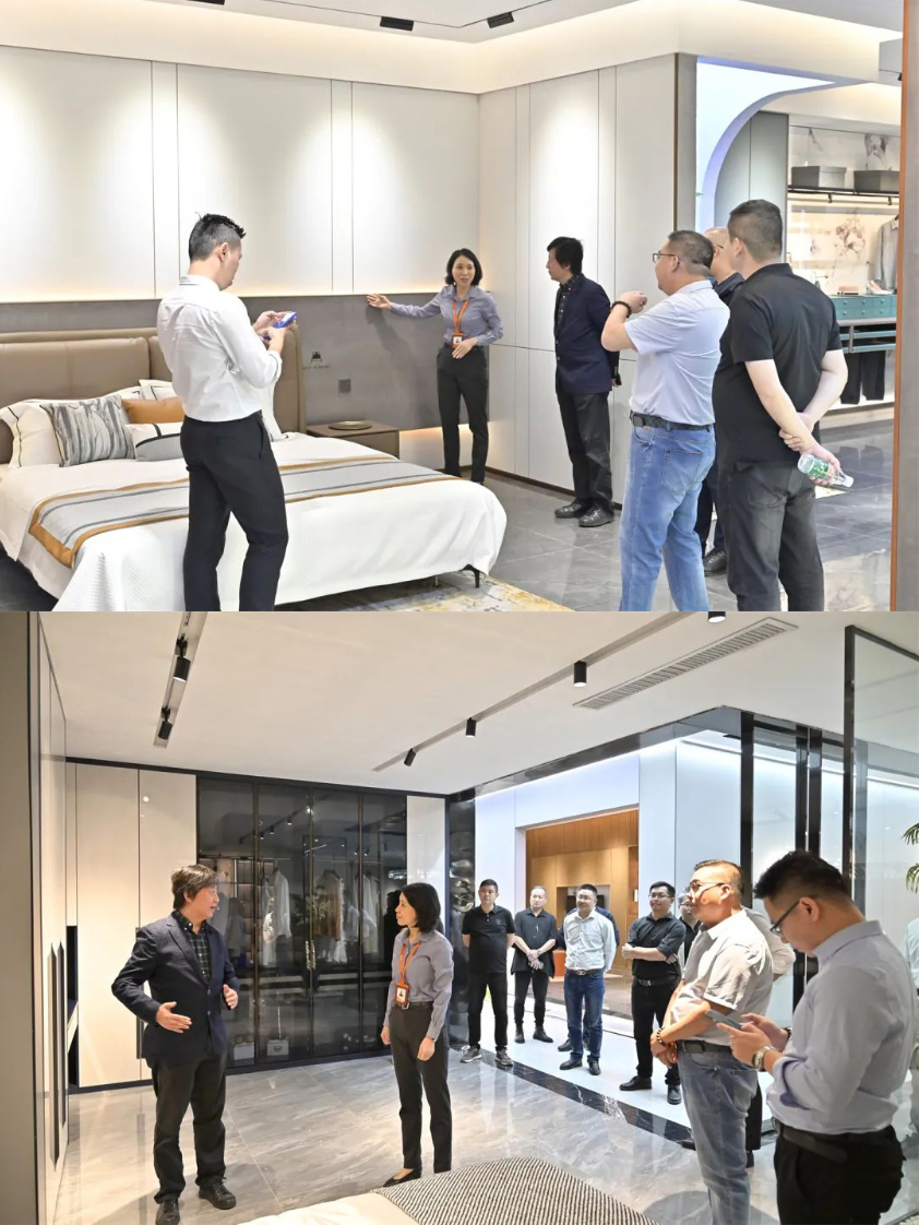 在皇朝定制家居体验馆中,每个空间,每个系列,从柜类定制到相应的空间配套成品家具,参访团一行在工作人员的带领下充分了解皇朝定制产品体系,对产品调性和工艺品质有了更清晰直观的认知。