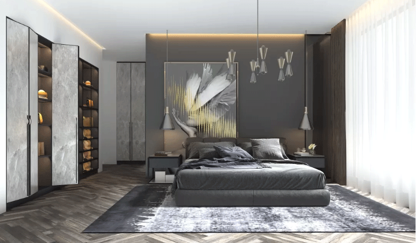 每天回家在内敛轻奢的卧室中,感受随意轻松的氛围,以精致优雅富有艺术情怀的感受慰藉自己,高端舒适的皮质软床,高级灰色调的床头背景墙,质感的金属摆件和布艺软装等衬托出整个环境高雅的格调, 星辰影视高清。
