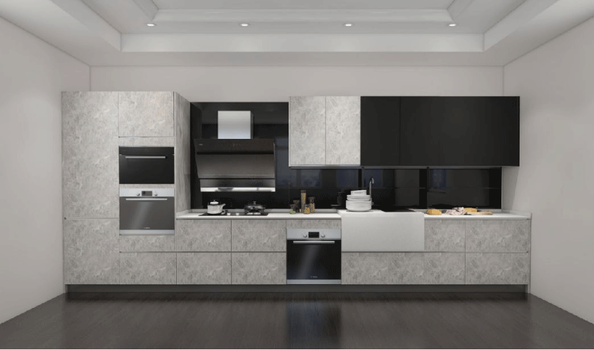 一家人温馨的氛围很大程度上得益于这款格调优雅的橱柜,一字型设计,造型极为简约,黑色窄边框玻璃门与大理石纹UV板相搭配,层次分明 在线影视,简约明了,让空间看起来更大气,更整体, 。