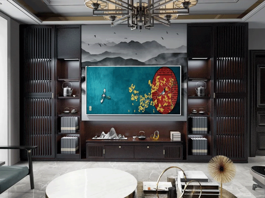 柜体谨遵对称之美,沿用轴对称建筑美学,格栅元素让室内尺度更立体,造型与细节处处尽显中式韵味, 在线影视