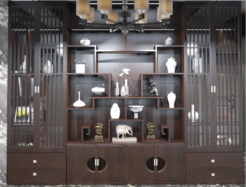 整体柜子以格栅门和金铜色拉手作为点缀,让整个柜体简而不空 星辰影视在线,中间是造型别致的博古架样式,营造出富贵大气的人文底蕴, 。