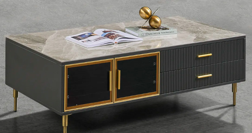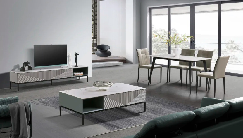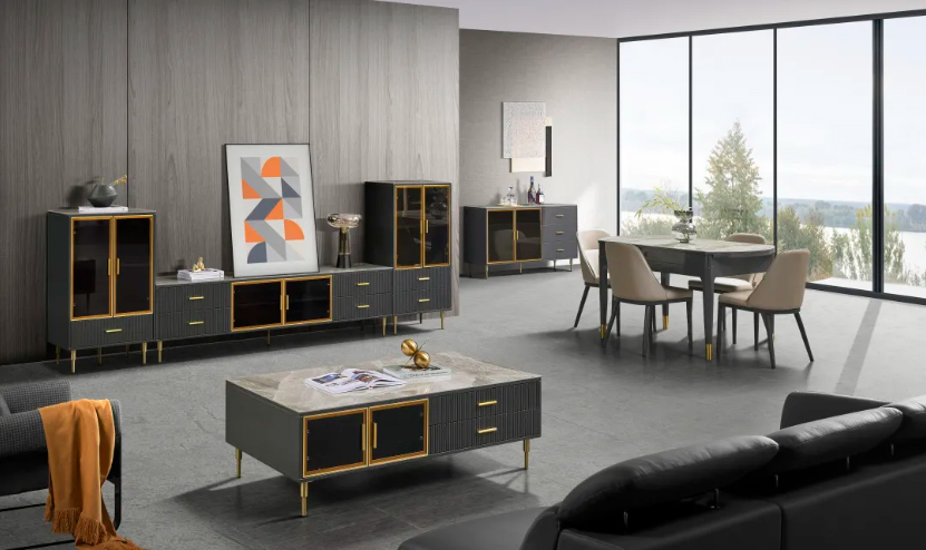 以茶几为例,台面采用意大利浅灰亮光岩板,色泽雅致清新,纹理飘逸灵动,营造出极具艺术气息的格调空间 星辰影院,此外,金色边框玻璃门搭配黑色烤漆柜体,通过简单的线条勾勒,走出千篇一律,在简与奢之间寻得平衡, 。