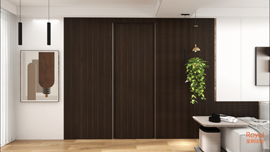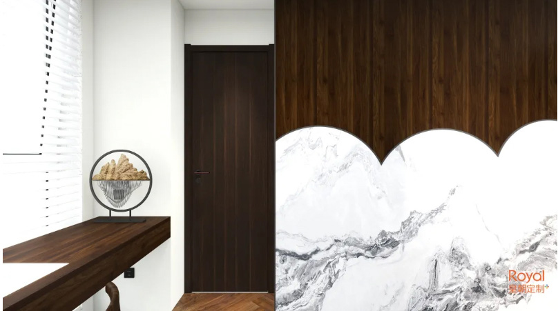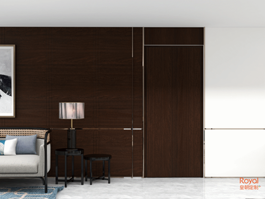 这是一款有着对比强烈的视觉效果的隐形门,纹理粗犷自然,颇有大气磅礴之势,风格上会更偏文艺。