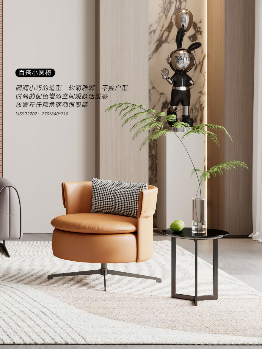 ② 时尚沙发椅:一抹活力橙,轻松提升空间时尚感;宽厚的座面和靠背,内部填充高回弹海绵,久坐不易塌陷,包裹性十足。