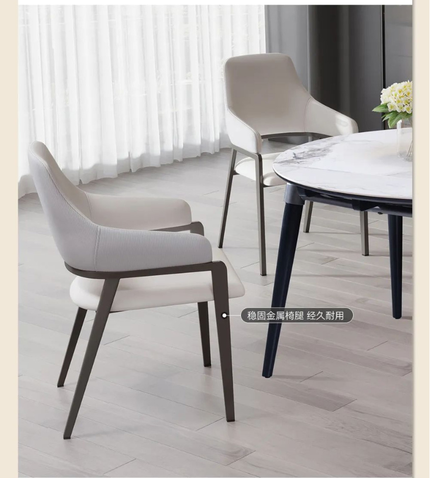 户型餐桌要怎么选才能既省空间又不失美感?MSN2206可伸缩餐桌,简直是小户型的福音!可拉伸的设计,让它可以根据不同场景变换不同的形态,用餐人少时方桌占地少,人多时只需将两侧的半月板拉出,秒变大气圆桌,再多的美味佳肴也放得下!台面选用了香奈儿岩板,纹理写意,淡雅素净;同时,它还具备耐刮磨耐高温高密度食品级别安全等优点,高颜值性能出众。木质导轨质感十足,推拉静音无卡顿,而且还会越用越顺滑;同时桌脚采用了八字斜角设计,视觉上美观通透,日常满足餐椅收纳,打扫卫生也很省心。就餐想要更有仪式感,那就少不了米奢这款雅致餐椅。环抱舒适靠背和宽大海绵座包,落座更惬意,吃饭也更香了!这样舒适与自在的餐厅,真的很难不心动!