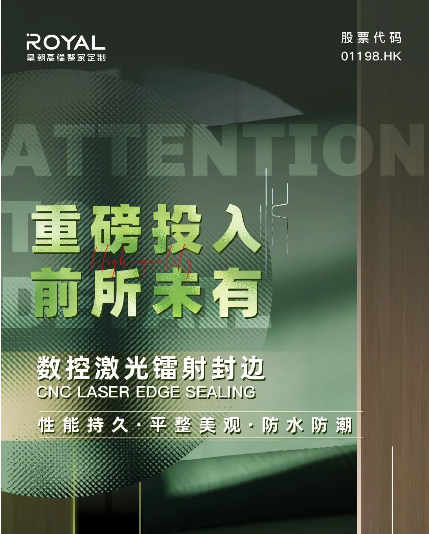 板材封边是全屋定制家具生产过程中最重要的一个工序,高品质的封边工艺造就高品质家具,给客户带来“高颜质”的精致生活体验。2023年皇朝正式宣布进军高端整家定制梯队,顺势推出五星皇朝价值体系,聚焦“产品价值”体系,重磅投入数控激光封边机,提高板材工艺标准,让更多的消费者花更少的钱,享受到更高颜值、更高品质的高端定制产品。
